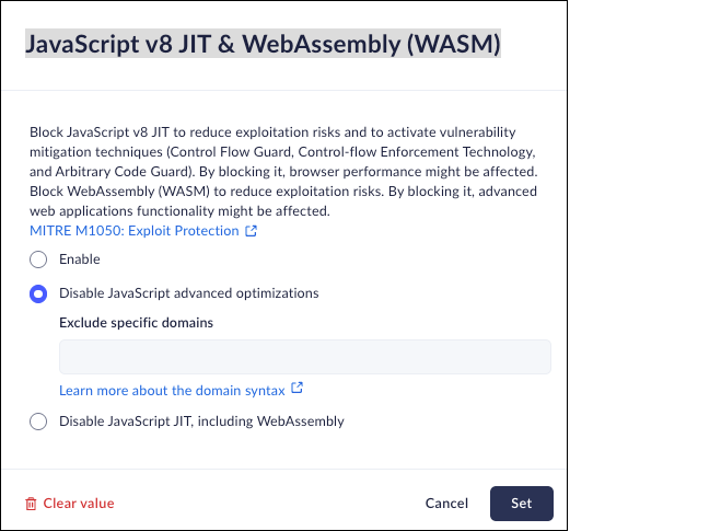 - Disable JavaScript advanced optimization - Disable use of JavaScript v8 JIT. You can optionally select specific domains to exclude.