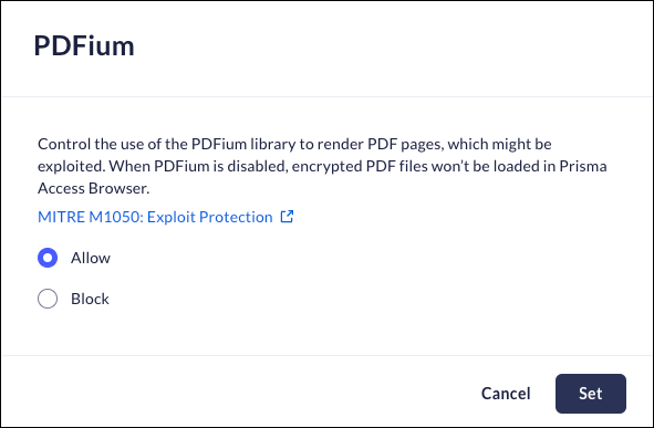 Mobile Browser - No supportThe PDFium library is used to render PDF files in Chromium browsers.This anti-exploitation policy controls the use of the PDFium library, which can be potentially exploited.When PDFium is disabled, the Prisma Access Browser will not be able to open regular or protected PDF files.- From Strata Cloud Manager, select ConfigurationPrisma Access Browser PolicyProfilesBrowser SecuritySelect PDFium.Select one of the following options: