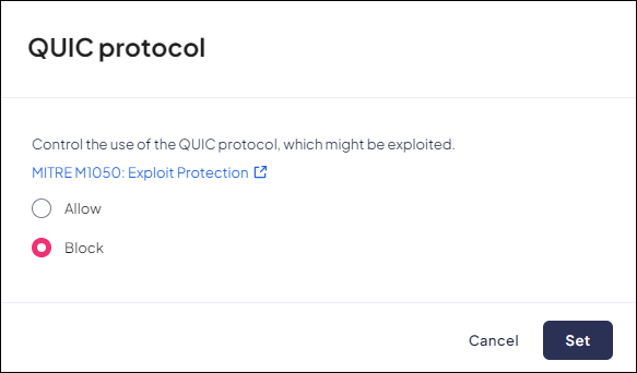 Mobile Browser - No supportQUIC (Quick UDP Internet Connections) is a new internet transport protocol developed by Google. QUIC solves several application-layer issues experienced by modern web applications while requiring little or no change from application writers. QUIC is very similar to TCP+TLS+HTTP2 but implemented on top of UDP.This anti-exploitation policy controls the use of the QUIC protocol, which can be potentially exploited.Note: Disabling QUIC protocol may impact different websites using it in a legitimate way.- From Strata Cloud Manager, select ConfigurationPrisma Access Browser PolicyProfilesBrowser SecuritySelect QUIC Protocol.Select one of the following options:
