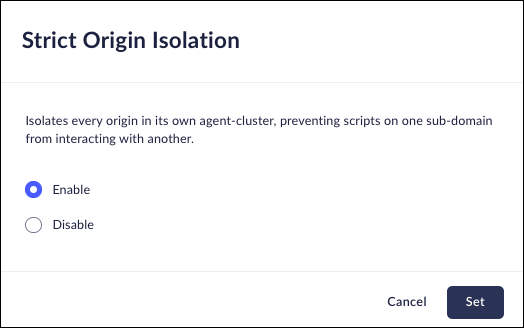 - Enable - Enabling stricter cross-origin isolation strengthens defenses against Spectre and XS-Leak attacks and is a necessary step for features like high-resolution SharedArrayBuffer. However, it may break legacy applications that rely on document.domain for cross-subdomain communication.