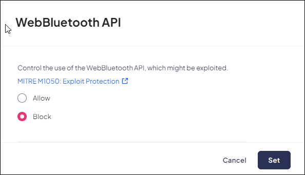 Mobile Browser - No supportThe WebBluetooth API provides a way for websites to communicate over GATT (Generic ATTribute Profile) with nearby user-selected Bluetooth devices in a secure and privacy-preserving way.This anti-exploitation policy controls the use of the WebBluetooth API, which can be potentially exploited.Note: Disabling WebBluetooth API may impact different websites using it in a legitimate way.When a user attempts to access a domain that is blocked, they will receive an on-screen notification, and a Log event will be created.- From Strata Cloud Manager, select ConfigurationPrisma Access Browser PolicyProfilesBrowser SecuritySelect WebBluetooth API.Select one of the following options: