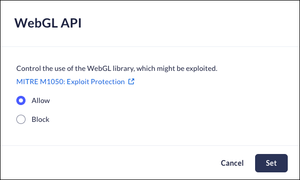 Mobile Browser - No supportWebGL is a JavaScript-based API that is used for rendering high performance interactive 2-and 3D graphics using hardware graphics acceleration features provided in the user's device.This anti-exploitation policy controls the use of the WebGL API, which can be potentially exploited.Note: Disabling WebGL API may impact different websites using it in a legitimate way.When a user attempts to access a domain that is blocked, they will receive an on-screen notification, and a Log event will be created.- From Strata Cloud Manager, select ConfigurationPrisma Access Browser PolicyProfilesBrowser SecuritySelect WebGL API.Select one of the following options: