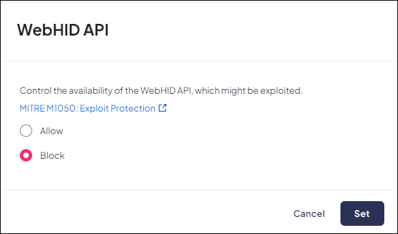 Mobile Browser - No supportThe WebHID API is used for providing access for Human Interface Devices. This feature permits access to alternative auxiliary devices, such as secondary keyboards and mouse-pointing devices.This anti-exploitation policy controls the use of the WebHID API, which can be potentially exploited.Note: Disabling WebHID API may impact different websites using it in a legitimate way.When a user attempts to access a domain that is blocked, they will receive an on-screen notification, and a Log event will be created.- From Strata Cloud Manager, select ConfigurationPrisma Access Browser PolicyProfilesBrowser SecuritySelect WebHID API.Select one of the following options: