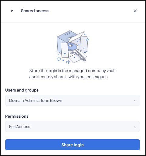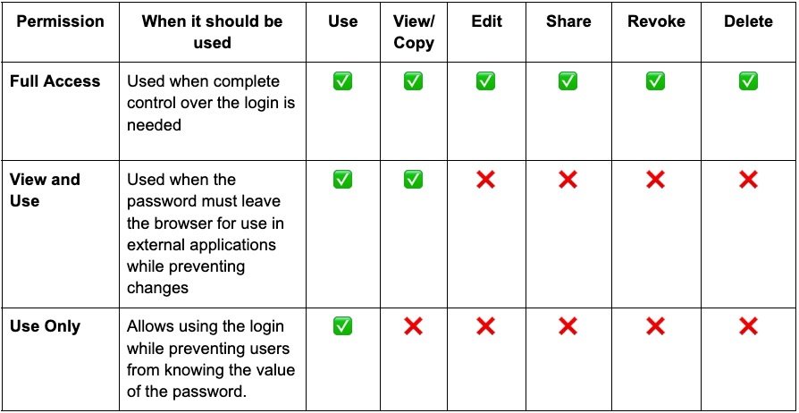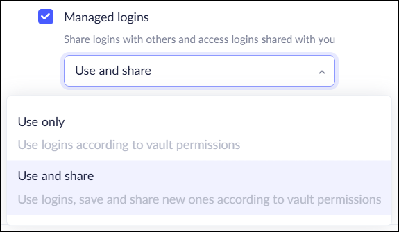 Managed logins are shared between users or by admins giving target users one of the following permissions: