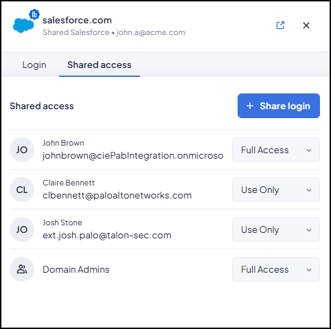 - Once a login is shared, you can manage the granted permissions in the Shared