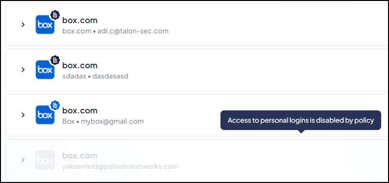 You can disable the “Personal store” option to prevent users from creating and managing their own private logins within the password manager. This control is beneficial when users should access only corporate-managed logins sent to them by administrators or managers, rather than using the tool as a general-purpose password manager. Common use cases include contractors and call center users. The system can dynamically apply this policy based on the rule's scope, including user group, device posture, network, or location.