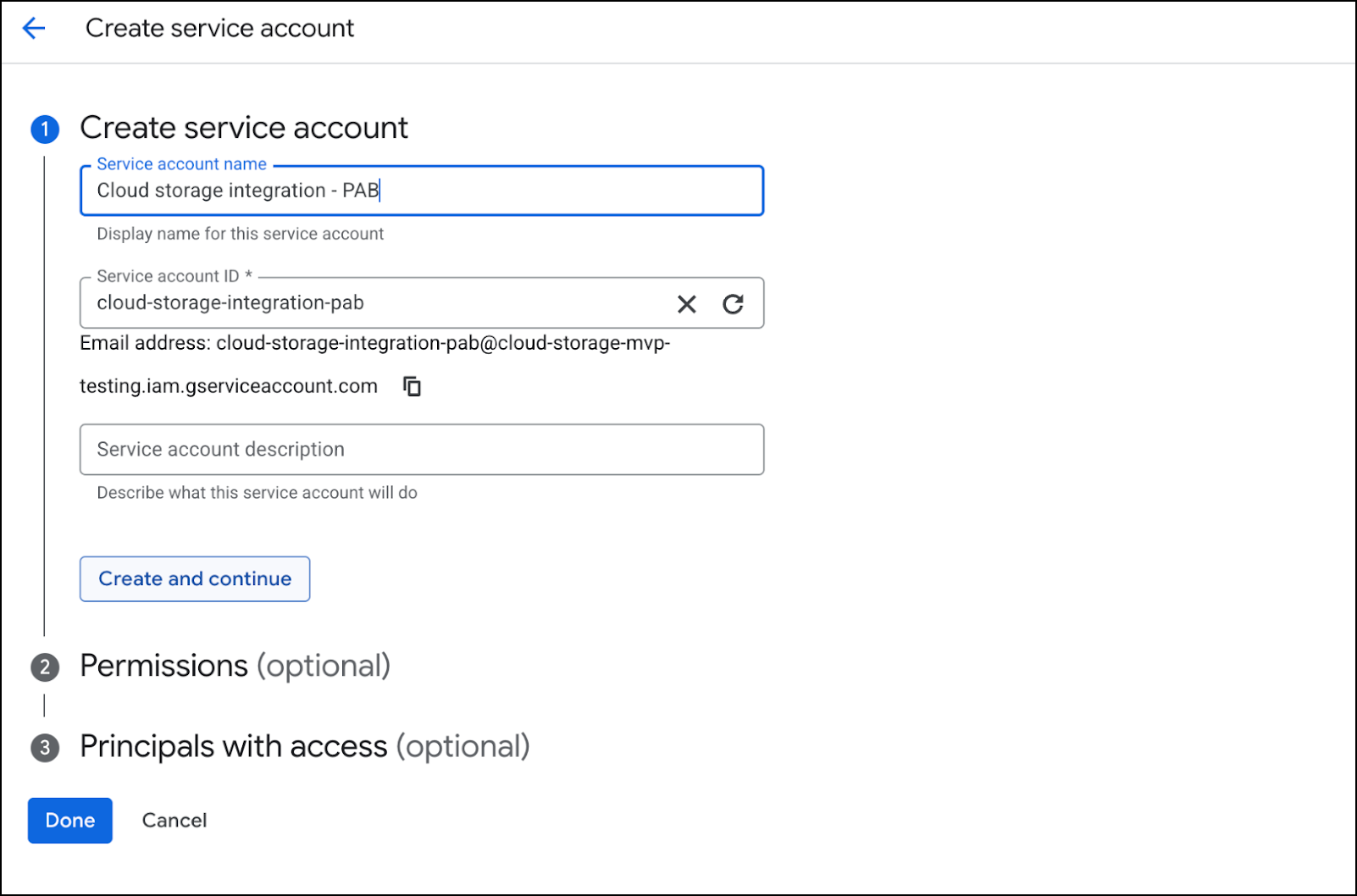 - Click Create and continue to generate the Service account ID. You can edit it, if needed.