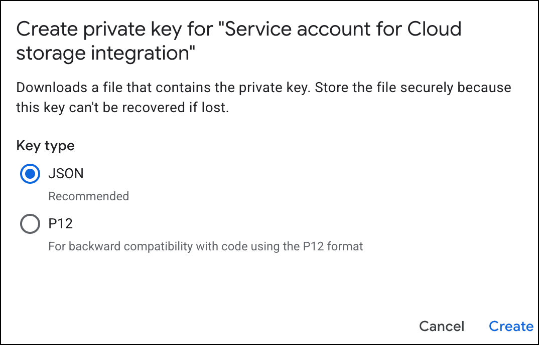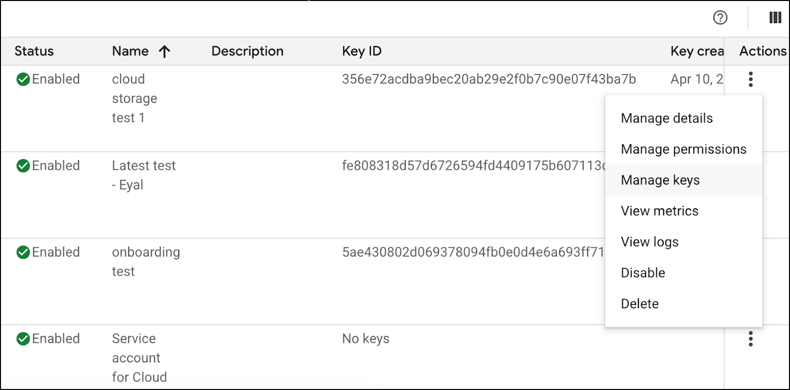 Continue through the steps until the service account is created.Generate a Private Key (JSON)- Locate your newly-created service account in the list.Click the More (⋮) icon under the Actions field, and select Manage Keys.