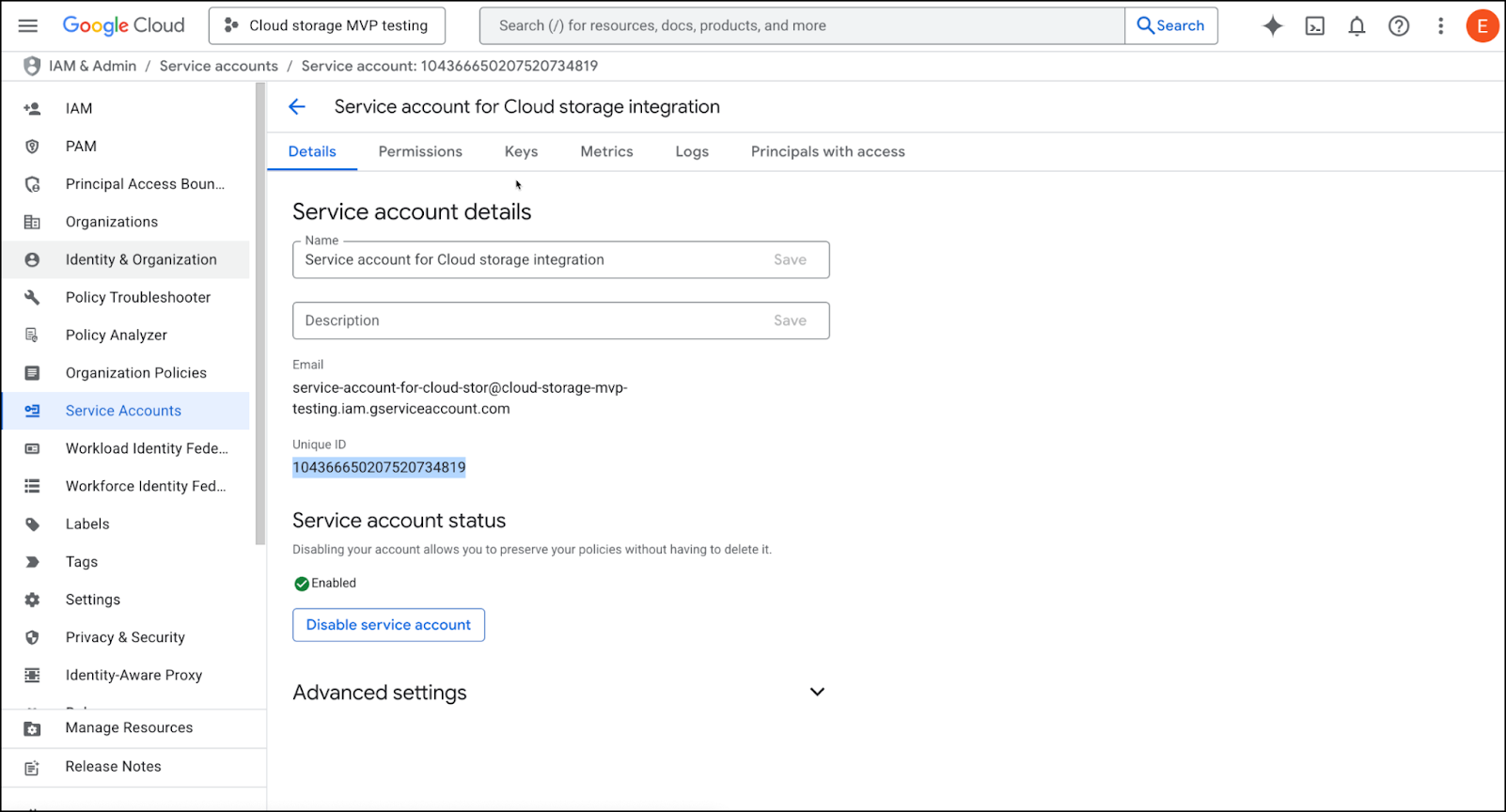 The system downloads a private key file to your computer. Store this file securely; it authenticates the service account.Retrieve the Client ID- Go back to the Service Accounts page in the Cloud Console.Click the name of your service account to open its details.Under the Details tab, locate the Client ID and copy it. You will use this in the next step.