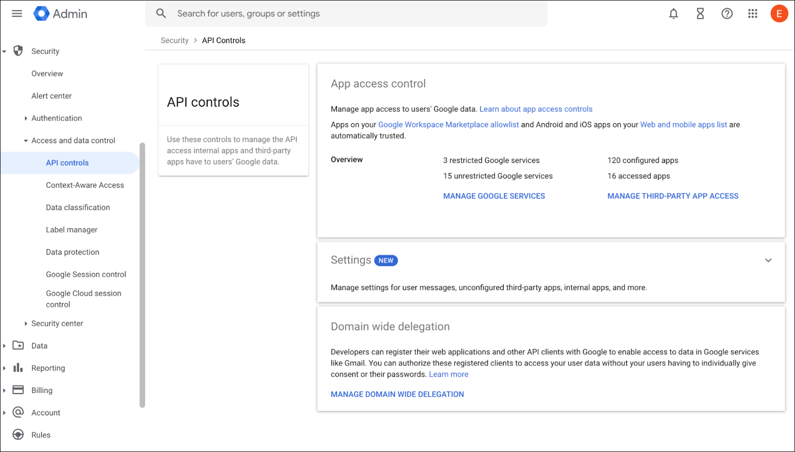 Delegate Domain-Wide Authority in Google Workspace.- Open a browser and navigate to theGoogle Admin Console.Sign in using a Super Admin account.From the left-hand menu, go to Security → API Controls.Scroll to the Domain-wide delegation section and click Manage Domain Wide Delegation.