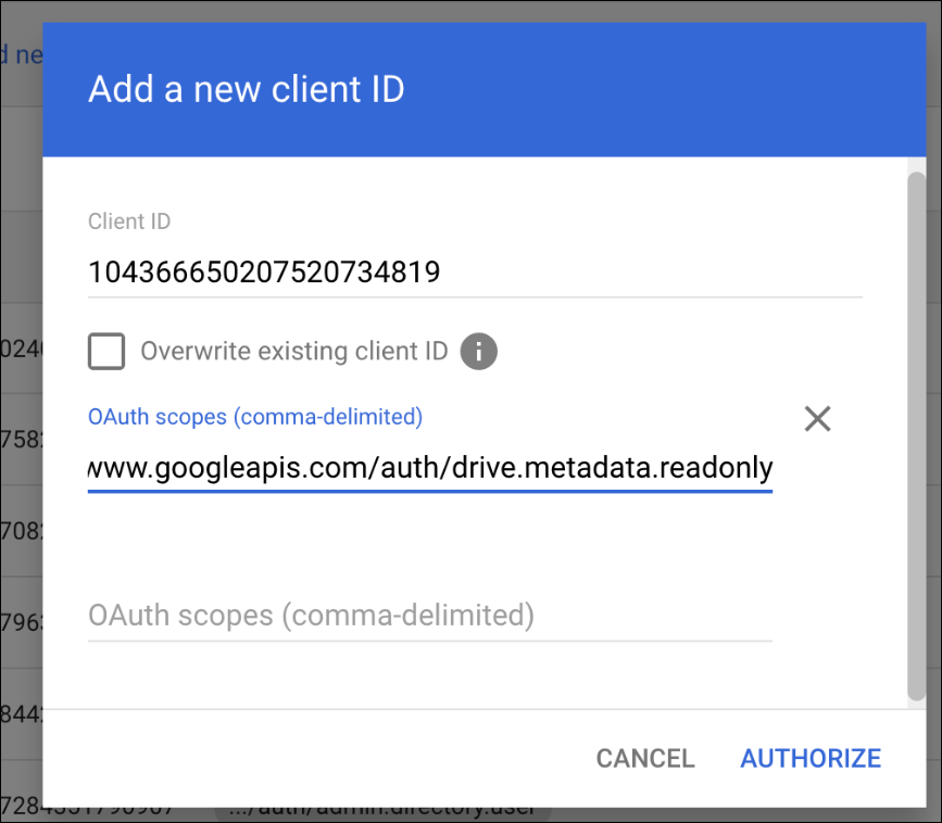 Click Add new to add a new Client ID.In the Client ID field, paste the ID you copied from your service account.In the OAuth Scopes field (comma-delimited), enter the following scopes:- https://www.googleapis.com/auth/drive.file