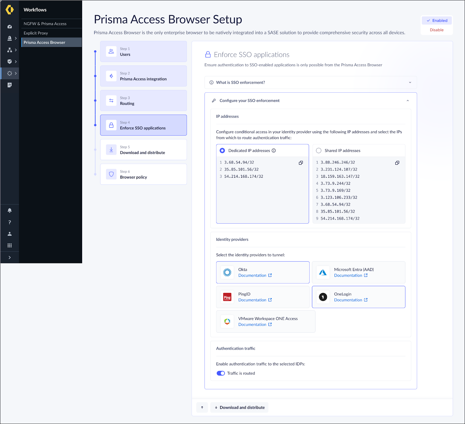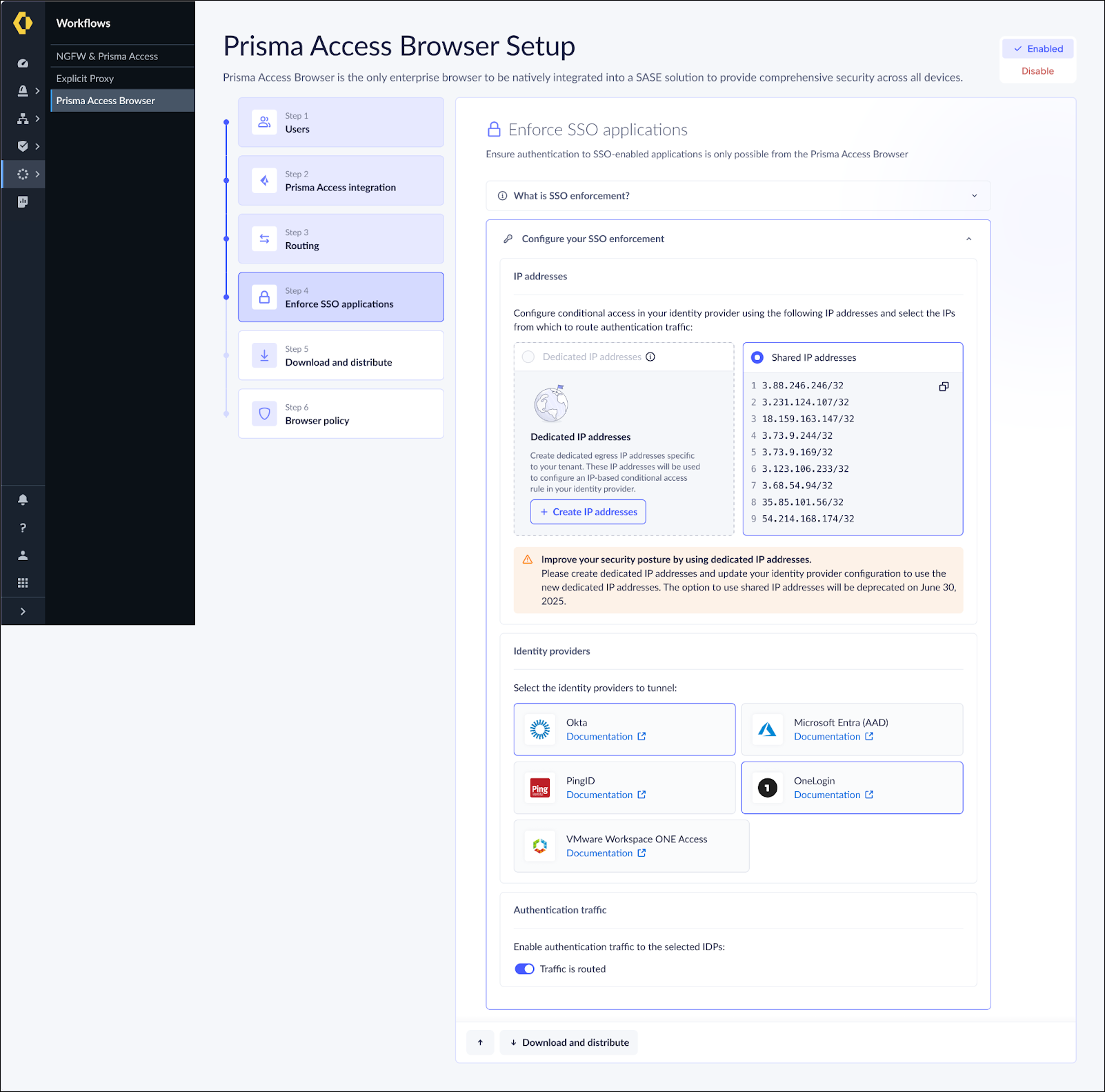 - Configure dedicated Egress IP Addresses- From the Strata Cloud Manager, go to Workflow → Prisma Access Browser → SSO Enforcement.Configuration → Onboarding → Prisma Access Browser → View.Click Create Dedicated Egress IP Addresses.This process can take a few minutes until the IP Addresses are available in all regions.Copy the list of generated IP addresses for use in your IdP configuration,![]() Configure your Identity Provider (IdP) Configure your Identity Provider (IdP)- Select your IdP provider from the list of supported providers and click Save:In case your IdP does not appear on the list or you're using a custom IdP, contact Support or your Account team to configure your custom IdP URL. If you use multiple identity providers, you can select more than one from the list.Follow the specific instructions for your selected IdP to configure conditional access with your dedicated egress IP addresses.![]() Enable Authentication Traffic Routing Enable Authentication Traffic Routing- Toggle the Authentication Traffic Routing switch to enable the feature.If you use Shared Authentication Gateway, continue with the Migration Guide for existing Customers (below).Validate the configuration by logging into an enforced application in your IdP:- Test using a commercial browser - the system should deny access.
