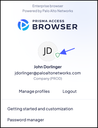 - Configured traffic routing: The browser’s configuration routes IdP authentication traffic through the Prisma Access Browser gateway.