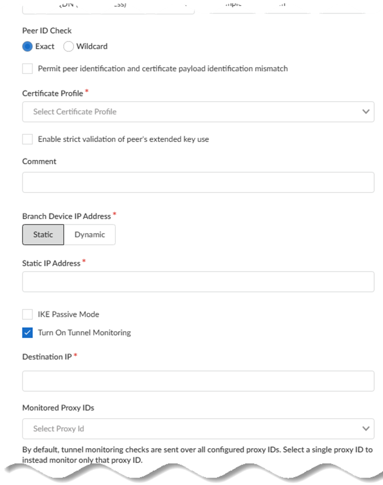 Monitoring. Enter a Tunnel Monitoring Destination IP address on the remote network for Prisma Access to determine whether the tunnel is up and, if your branch IPSec device uses a policy-based VPN, enter the associated Proxy ID as the Monitored Proxy ID.