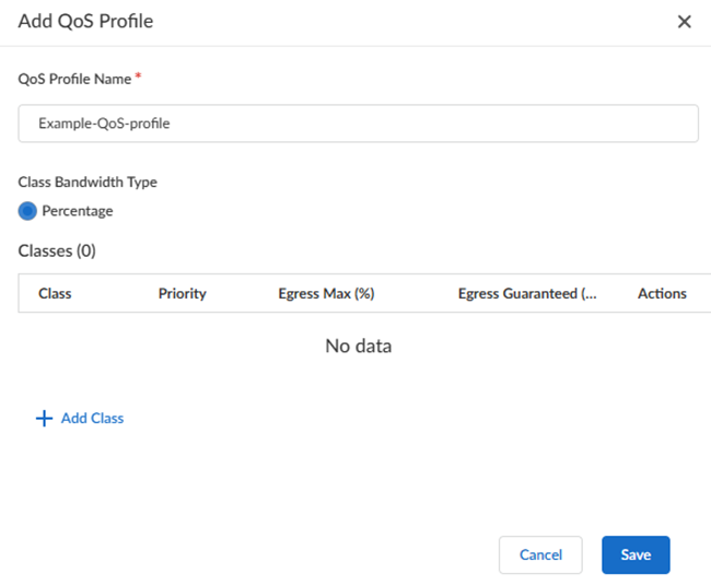- Select a Class Bandwidth Type of Percentage. Prisma Access does not support bandwidth types of Mbps in site-based QoS profiles.