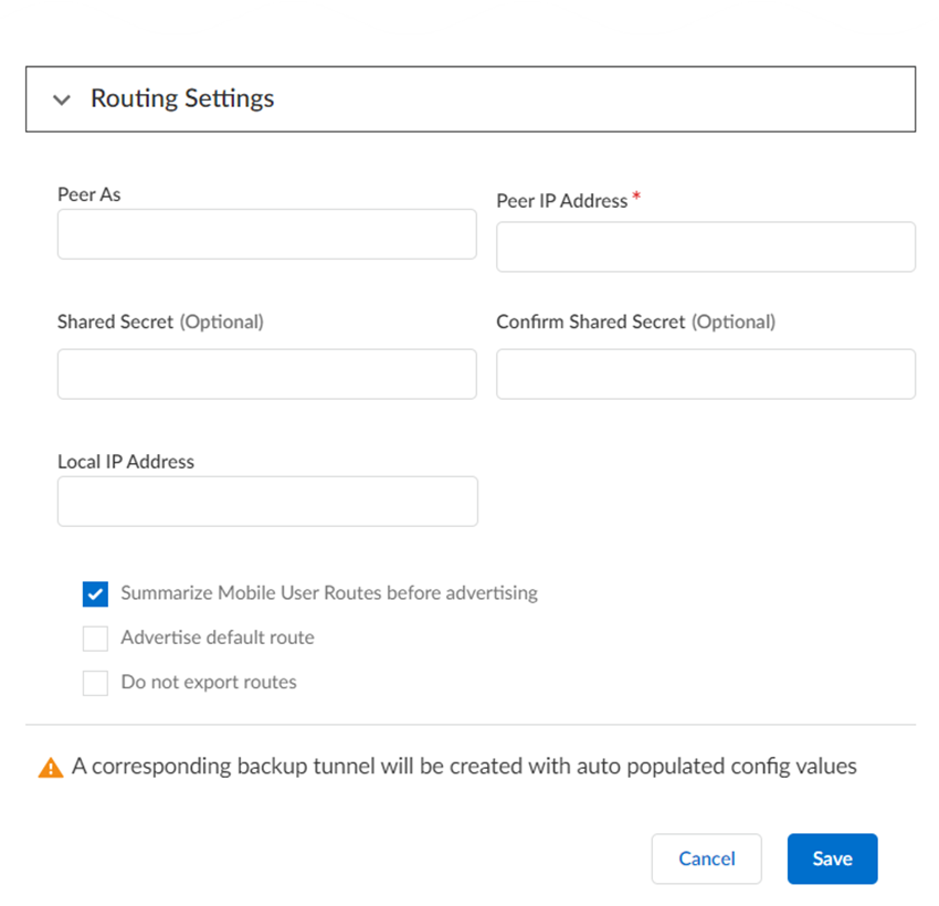 - (Optional) Summarize Mobile User Routes before advertising to reduce the number of mobile user IP subnet advertisements over BGP to your CPE by having Prisma Access summarize the subnets before it advertises them.