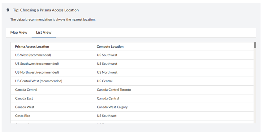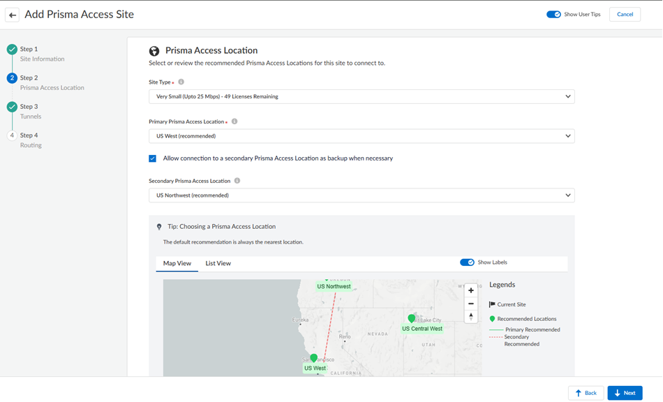 - From Strata Cloud Manager, go to ConfigurationOnboardingOnboard Branch Sites.![]() In Branch Site Management, Add a third-party branch site.If you are licensed for Prisma SD-WAN and want to configure that type of branch site, use the procedure to configure Prisma SD-WAN.Add Site and give the remote network a descriptive Site name.Select the City and Country of the site.For more precise searches, add an address. In Branch Site Management, Add a third-party branch site.If you are licensed for Prisma SD-WAN and want to configure that type of branch site, use the procedure to configure Prisma SD-WAN.Add Site and give the remote network a descriptive Site name.Select the City and Country of the site.For more precise searches, add an address.![]() Click Next.Select a location and a site type. Click Next.Select a location and a site type.- Select a Site Type.The types are based on bandwidth.Some locations don't support X-Large sites; in this case, that choice is grayed out.Select a Primary Prisma Access Location.If multiple locations are Recommended in the list; select the location that works best for your deployment.![]() (Optional) To create a secondary (backup) site, select Allow connection to a secondary Prisma Access Location as backup when necessary and then select a Secondary Prisma Access Location.If you select this choice, Prisma Access prepopulates the best secondary location or locations that are in a different compute location than the primary location. If multiple locations are Recommended; select the location that works best for your deployment.You can toggle between Map View and List View to see the best location for your site. (Optional) To create a secondary (backup) site, select Allow connection to a secondary Prisma Access Location as backup when necessary and then select a Secondary Prisma Access Location.If you select this choice, Prisma Access prepopulates the best secondary location or locations that are in a different compute location than the primary location. If multiple locations are Recommended; select the location that works best for your deployment.You can toggle between Map View and List View to see the best location for your site.![]() Select a QoS Profile to use for this site, or Add a new one.Prisma Access uses a single QoS Profile per site. Select a QoS Profile to use for this site, or Add a new one.Prisma Access uses a single QoS Profile per site.![]() If you have not yet created a QoS Profile, Add a QoS Profile, specifying the following values: If you have not yet created a QoS Profile, Add a QoS Profile, specifying the following values:- Enter a unique QoS Profile Name.