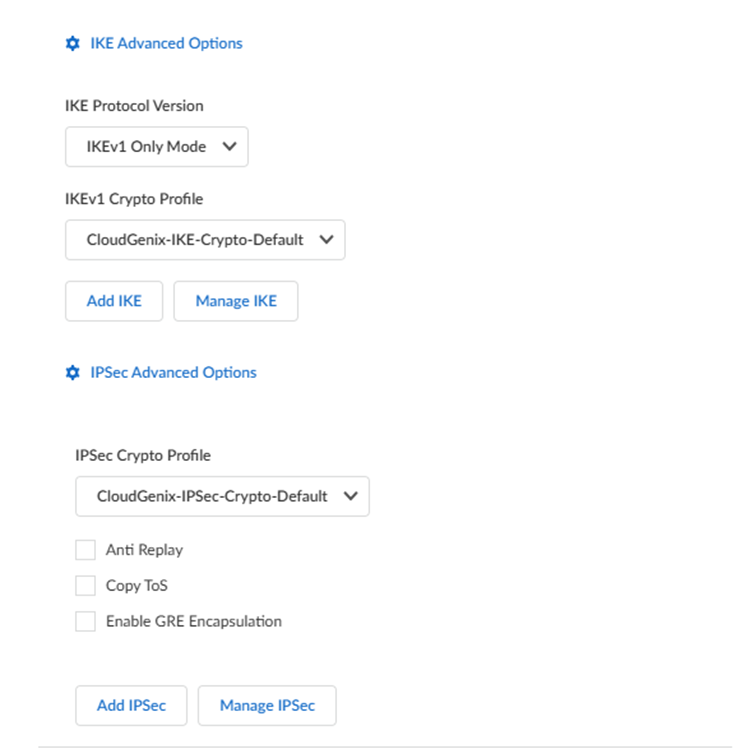 Profile.To add a crypto profile, Add IPSec. To manage an existing IPSec profile, Manage IPSec and select the profile to edit.![]()