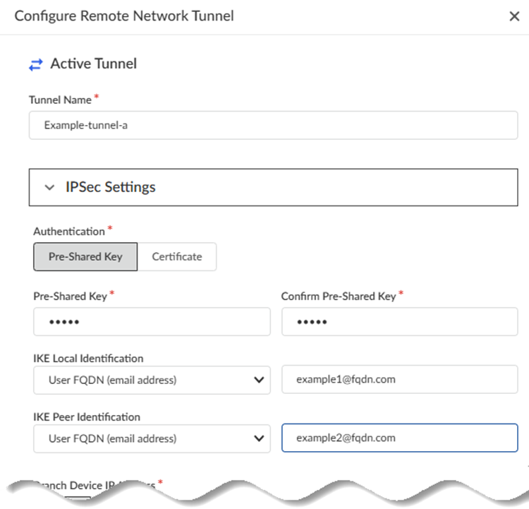 Certificate).If you specify Pre-Shared Key, enter and confirm the Pre-Shared Key.If you specify a Certificate, enter the Local Certificate to use. This certificate must already exist in Strata Cloud Manager.