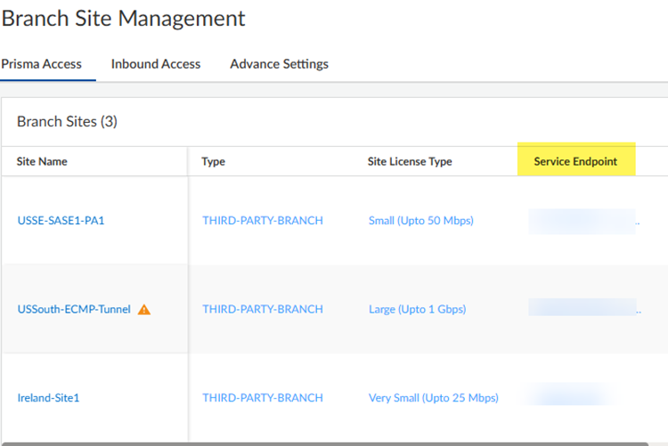 Save your IPSec tunnel changes.![]() Save & Exit.Push Configuration to save your configuration changes, making sure to select Remote Networks in the Push Scope. Save & Exit.Push Configuration to save your configuration changes, making sure to select Remote Networks in the Push Scope.![]() Find the Service Endpoint address (the IP or FQDN address you use on your CPE to terminate the IPSec tunnel).As a best practice, specify the FQDN instead of the IP address. Find the Service Endpoint address (the IP or FQDN address you use on your CPE to terminate the IPSec tunnel).As a best practice, specify the FQDN instead of the IP address.- Go to ConfigurationPrisma Access SetupBranch SitesPrisma Access.Find the Service Endpoint address.![]()