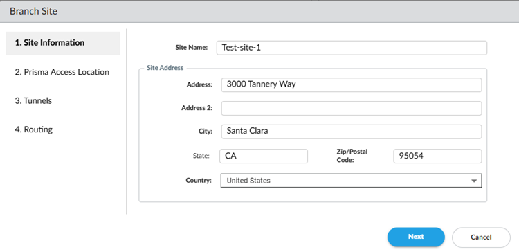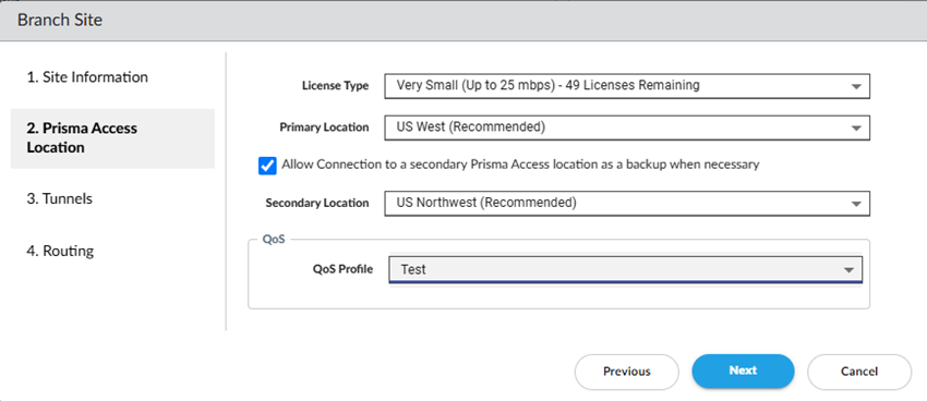 Go to the Next screen.Select a site type, a primary location, and, optionally, a secondary location.- Select a site type (License Type).The types are based on bandwidth.Some locations don't support X-Large sites; in this case, that choice isn’t selectable.Select a Primary Prisma Access Location.If multiple locations are Recommended in the list; select the location that works best for your deployment.(Optional) To create a secondary (backup) site, select Allow connection to a secondary Prisma Access Location as backup when necessary and then select a Secondary Prisma Access Location.If you select this choice, Prisma Access prepopulates the best secondary location or locations that are in a different compute location than the primary location. If multiple locations are Recommended; select the location that works best for your deployment.(Optional) If you want to enable QoS for your site, select the QoS Profile you created at the start of this procedure and go to the Next step.