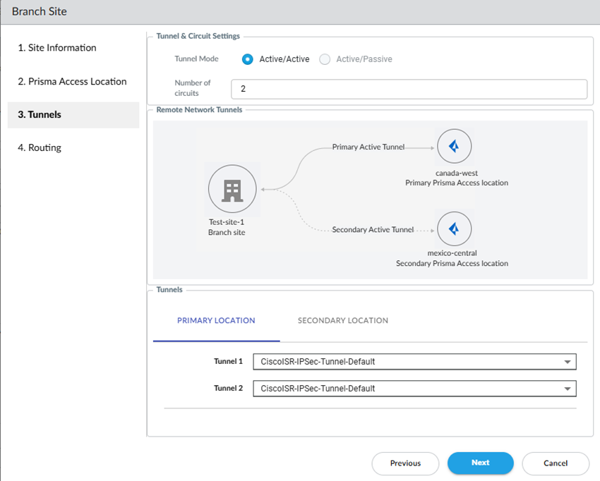 - If you select Active/Active, Prisma Access Prisma Access utilizes either two or four ISP circuits to create either two or four active tunnels, respectively.