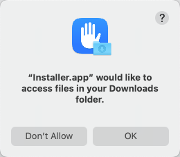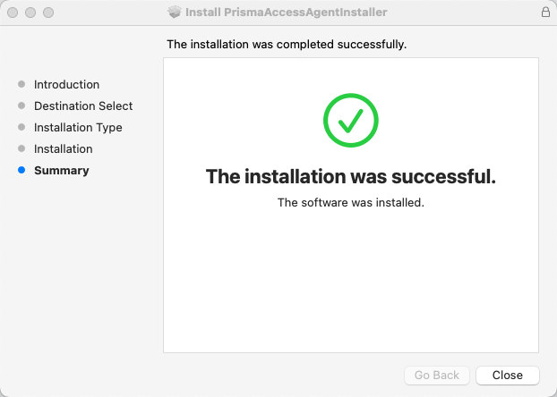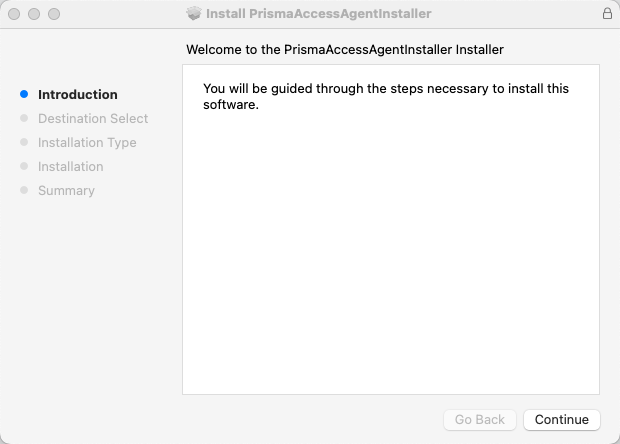 - Obtain the Prisma Access Agent package that your administrator provided to you. The package name is in the following format:PrismaAccessAgentInstaller_<version>.pkgIn your Downloads folder (or wherever you placed the installation package), open the installation package and follow the prompts to install the Prisma Access Agent.- From the installer, click Continue.![]() Select the folder for the installation of the Prisma Access Agent and click Continue. Select the folder for the installation of the Prisma Access Agent and click Continue.![]() Review the information in the Installation Type page and click Install. Review the information in the Installation Type page and click Install.![]() When prompted, enter your User Name and Password, and then click Install Software to begin the installation.Alternatively, you can use Touch ID (if it's enabled) to complete this step.When prompted to allow the installer to access files in the folder where you downloaded the installation package, click OK. When prompted, enter your User Name and Password, and then click Install Software to begin the installation.Alternatively, you can use Touch ID (if it's enabled) to complete this step.When prompted to allow the installer to access files in the folder where you downloaded the installation package, click OK.![]() By default, macOS blocks the Prisma Access Agent system extensions. The system or network extensions appear if your administrator configured the Prisma Access Agent with traffic forwarding rules for: By default, macOS blocks the Prisma Access Agent system extensions. The system or network extensions appear if your administrator configured the Prisma Access Agent with traffic forwarding rules for:- Split tunneling—Directs network traffic through or outside of the Prisma Access connection.