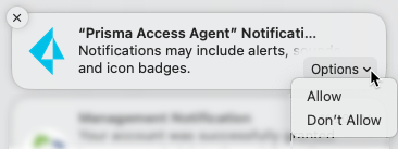 If your administrator enabled the feature to enforce Prisma Access connections for network access, you will be prompted to add a configuration to filter network content. To proceed, click Allow.![]() After you allow this, the Prisma Access Agent will filter and monitor your network connections for security purposes.When the installation is complete, Close the installer. After you allow this, the Prisma Access Agent will filter and monitor your network connections for security purposes.When the installation is complete, Close the installer.![]() If your administrator configured the agent to install the Access Experience app along with the Prisma Access Agent, click OK so that you won't be prompted again.Click the Prisma Access Agent notifications pop-up to open the Notifications preferences window.If prompted, enable Prisma Access Agent notifications.When the Prisma Access Agent notifications pop-up appears on your desktop, move your cursor over the pop-up and select OptionsAllow. If your administrator configured the agent to install the Access Experience app along with the Prisma Access Agent, click OK so that you won't be prompted again.Click the Prisma Access Agent notifications pop-up to open the Notifications preferences window.If prompted, enable Prisma Access Agent notifications.When the Prisma Access Agent notifications pop-up appears on your desktop, move your cursor over the pop-up and select OptionsAllow.![]() For the Prisma Access Agent to access data in the Safari browser, you must grant full disk access to the Security Extension and the Prisma Access Agent. For the Prisma Access Agent to access data in the Safari browser, you must grant full disk access to the Security Extension and the Prisma Access Agent.- From macOS, select System SettingsPrivacy & SecurityFull Disk Access. Enable Prisma Access Agent and securityExtension from the list of apps.![]() When prompted, Quit & Reopen the Prisma Access Agent for the changes to take effect. When prompted, Quit & Reopen the Prisma Access Agent for the changes to take effect.Uninstall the Prisma Access Agent (macOS)You can uninstall the Prisma Access Agent manually if you no longer need to use it. Keep in mind that by uninstalling the agent, you will no longer have access to your corporate network, and your endpoint won't be protected by your organization's security policies.Before you begin, if the administrator enabled the anti-tamper feature for the Prisma Access Agent, you must obtain the anti-tamper unlock password from the administrator. To uninstall the agent, you must have elevated administrative rights.Complete the following steps to uninstall the Prisma Access Agent from the command-line interface.- Disable the Prisma Access Agent by running the following command:sudo /Applications/Prisma\ Access\ Agent.app/Contents/Helpers/pacli protect disable - Enter your sudo password (user account password) when prompted.If prompted for the supervisor password, enter the anti-tamper unlock password.Run the following command to uninstall the agent:/Applications/Prisma\ Access\ Agent.app/Contents/Helpers/uninstaller Enter your sudo password (user account password) when prompted.If prompted for the supervisor password, enter the anti-tamper unlock password. Press Enter to begin the uninstallation of the agent and its extensions.