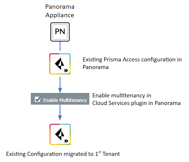 - Enable multitenancy. If you have an existing Prisma Access instance, enabling multitenancy automatically migrates your existing Prisma Access configuration to the first tenant.You give the first (migrated) tenant a name and specify an access domain. Prisma Access migrates the templates, template stacks, and device groups associated with the existing configuration and associates them with the access domain you create.After you migrate your initial configuration, the administrative user in Panorama becomes a superuser with the ability to create and manage all Prisma Access tenants.