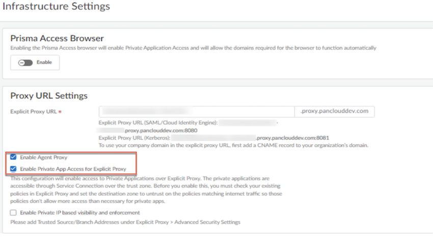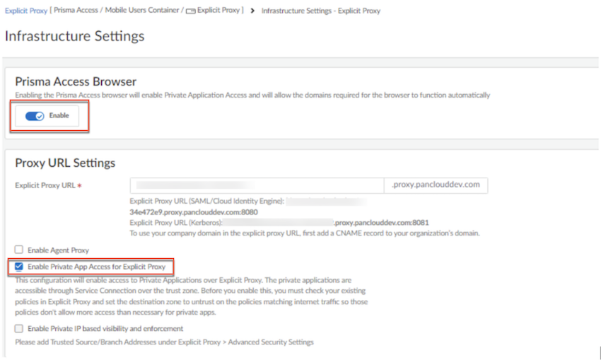 - Enable private application access using a regular browser.- Select ConfigurationNGFW and Prisma AccessConfiguration ScopeExplicit ProxyExplicit Proxy Infrastructure Settings Enable Agent ProxyEnable Private App Access for Explicit Proxy.![]()  ![]()