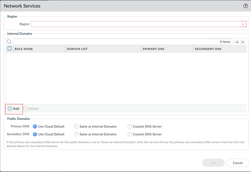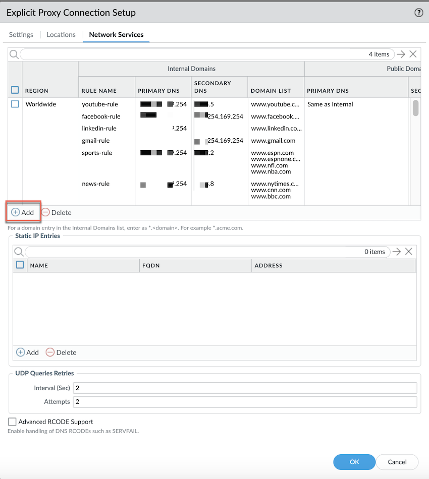 - Add an Explicit Proxy DNS server rule.- Go to ConfigurationNGFW and Prisma AccessConfiguration ScopePrisma AccessExplicit ProxyInfrastructure Settings.Click the settings icon and go to Client DNS.Add Region and give it a unique name.If you specify multiple proxy settings with a mix of Worldwide and theater settings, Prisma Access uses the settings for the location group, then theater, then Worldwide. Prisma Access evaluates the rules from top to bottom in the list.Select a region or location or select Worldwide.Add Region and give it a unique name.Add the DNS Server's IP address.![]() Choose whether or not you want Prisma Access to Resolve internal domains; if you do, Add one or more Internal Domain Resolve Rules. Choose whether or not you want Prisma Access to Resolve internal domains; if you do, Add one or more Internal Domain Resolve Rules.![]() Currently, Internal Domain Resolve Rules is only supported for Prisma Access Browser and Agent Proxy.Add and define the Internal Domain Resolve Rules.Add a unique Name for the rule and a custom IP address under Primary DNS and Secondary DNS.Select Prisma Access Default to use the default Prisma Access DNS server to resolve internal domains. If you want your internal DNS server to only resolve the domains you specify, enter the domains to resolve in the Domain List.If you have a Custom DNS server that can access your internal domains, specify the Primary DNS and Secondary DNS server IP addresses. Currently, Internal Domain Resolve Rules is only supported for Prisma Access Browser and Agent Proxy.Add and define the Internal Domain Resolve Rules.Add a unique Name for the rule and a custom IP address under Primary DNS and Secondary DNS.Select Prisma Access Default to use the default Prisma Access DNS server to resolve internal domains. If you want your internal DNS server to only resolve the domains you specify, enter the domains to resolve in the Domain List.If you have a Custom DNS server that can access your internal domains, specify the Primary DNS and Secondary DNS server IP addresses.![]() If you want your internal DNS server to only resolve the domains you specify, enter the domains to resolve in the Domain Lists. Specify an asterisk in front of the domain; for example, *.acme.com.Use Static IP entries to resolve FQDNs to specific IP addresses.Add UDP Queries. You can add Interval (Sec) and specify the number of Attempts for the query.If you want to enable handling of DNS RCODEs, enable Advanced RCODE Support to allow the primary DNS server to fail over to the secondary DNS server, and Save.A DNS response code of SERVFAIL refers to a communication error with the primary DNS server, and a DNS response code of REFUSED means that the primary DNS server refused to provide the requested information. In both cases, the service fails over to the secondary DNS server. If you want your internal DNS server to only resolve the domains you specify, enter the domains to resolve in the Domain Lists. Specify an asterisk in front of the domain; for example, *.acme.com.Use Static IP entries to resolve FQDNs to specific IP addresses.Add UDP Queries. You can add Interval (Sec) and specify the number of Attempts for the query.If you want to enable handling of DNS RCODEs, enable Advanced RCODE Support to allow the primary DNS server to fail over to the secondary DNS server, and Save.A DNS response code of SERVFAIL refers to a communication error with the primary DNS server, and a DNS response code of REFUSED means that the primary DNS server refused to provide the requested information. In both cases, the service fails over to the secondary DNS server.![]() Push Config to save and push your configuration changes. Push Config to save and push your configuration changes.DNS Resolution for Mobile Users—Explicit Proxy Deployments (Panorama)This task shows the possible configurations you can use for Prisma Access to resolve DNS queries for Explicit Proxy users.To configure DNS Proxy settings, complete the following steps:- Add an Explicit Proxy DNS server rule.- Go to PanoramaCloud ServicesConfigurationExplicit ProxyExplicit Proxy Connection Setup.Select ConfigureNetwork Services.![]() Add to add a region. Select a region or location or select Worldwide. Add to add a region. Select a region or location or select Worldwide.![]() Add a unique RULE NAME. If you want your internal DNS server to only resolve the domains you specify, enter the domains to resolve in the DOMAIN LIST. Specify an asterisk in front of the domain; for example, *.acme.com.Add a custom IP address under PRIMARY DNS and SECONDARY DNS. You can either Use Cloud Default or use a Custom DNS Server. Add a unique RULE NAME. If you want your internal DNS server to only resolve the domains you specify, enter the domains to resolve in the DOMAIN LIST. Specify an asterisk in front of the domain; for example, *.acme.com.Add a custom IP address under PRIMARY DNS and SECONDARY DNS. You can either Use Cloud Default or use a Custom DNS Server.![]() If you have a Custom DNS Server that can access your internal domains, specify the Primary DNS and Secondary DNS server IP addresses.Select OK to save the region and the rule.Use Static IP entries to resolve FQDNs to specific IP addresses.Add UDP Queries Retries. You can add Interval (Sec) and specify the number of Attempts for the query.If you want to enable handling of DNS RCODEs, enable Advanced RCODE Support to allow the primary DNS server to fail over to the secondary DNS server, and OK.A DNS response code of SERVFAIL refers to a communication error with the primary DNS server, and a DNS response code of REFUSED means that the primary DNS server refused to provide the requested information. In both cases, the service fails over to the secondary DNS server.Commit and push to Explicit_Proxy_Device_Group. If you have a Custom DNS Server that can access your internal domains, specify the Primary DNS and Secondary DNS server IP addresses.Select OK to save the regio