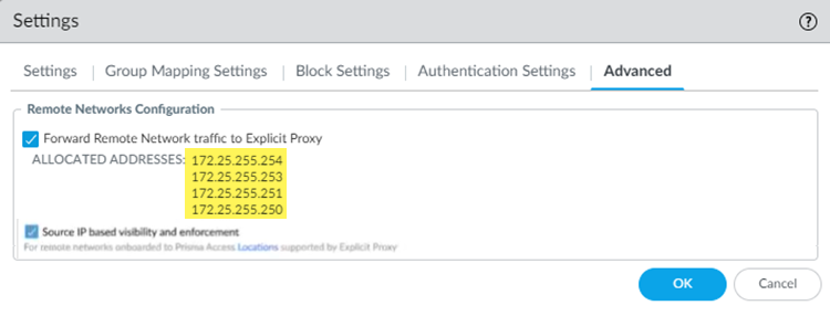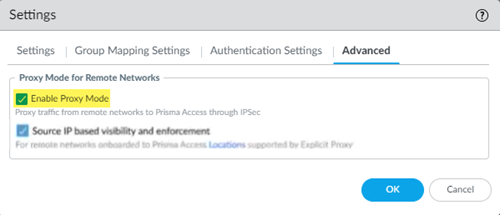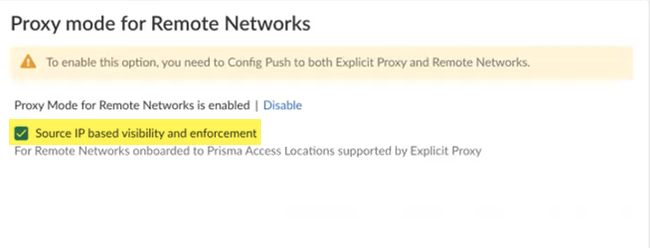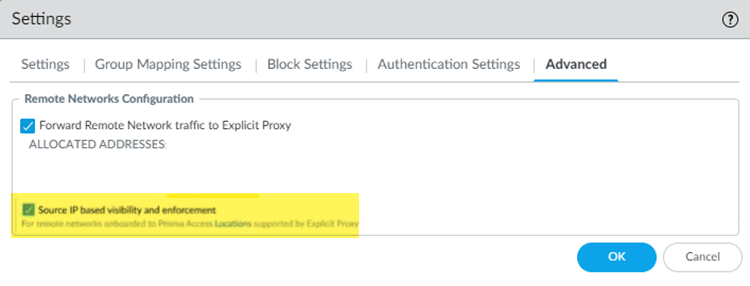 To leverage the source IP addresses of the systems in your branch locations that are forwarding traffic to explicit proxy, select Source IP based visibility and enforcement.This functionality has these requirements:- A minimum Prisma Access dataplane of 10.2.4