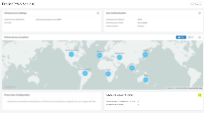 - Configure your explicit proxy setup and onboard the explicit proxy locations you want to add.Onboard your remote networks if you have not done so already.You must enable Prisma Access remote networks in the locations that are supported with explicit proxy.Push Config, being sure that Mobile Users—Remote Workforce and Remote Networks are selected in the Push scope.The push operation retrieves and anycast addresses you need to integrated explicit proxy with the remote network.Get the anycast IP addresses you use for your explicit proxy or remote network deployment.