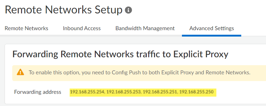 Select PanoramaCloud ServicesConfigurationRemote Networks.Onboard your Remote Network Locations if you have not done so already.You must enable Prisma Access remote networks in the locations that are supported with explicit proxy.Select CommitCommit and Push.Edit Selections and, in the Prisma Access tab, make sure Prisma Access for networks is selected in the Push Scope, then click OK.Commit and Push your changes.You must perform a commit and push for your remote networks for Prisma Access to retrieve the IP addresses used in an explicit proxy/remote network deployment.Return to the explicit proxy Settings (PanoramaCloud ServicesConfigurationMobile Users—Explicit ProxySettingsAdvanced) and make a note of the ALLOCATED ADDRESSES that display in under Remote Networks Configuration.