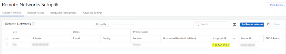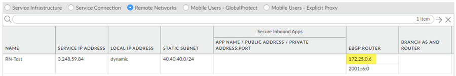 (Optional) Find the unicast address you use for your explicit proxy/remote network deployment.Use the unicast IP address in the PAC file only if you want to target a specific remote network to forward traffic to explicit proxy. If you want to use all deployed remote networks to forward traffic to explicit proxy, use the anycast addresses.- Select PanoramaCloud ServicesStatusNetwork DetailsRemote Networks.Make a note of the EBGP Router address.If you have IPv4 and IPv6 addresses, make a note of the IPv4 address.This address is also known as the loopback address. If you have made configuration changes that changed the EBGP router address, you can retrieve the loopback IP address using the Prisma Access legacy API.