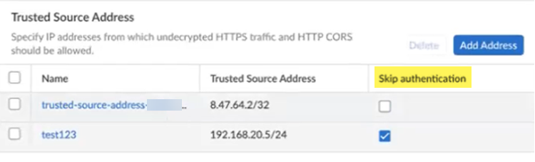 Add a policy to allow traffic bound to anycast and unicast IP on remote networks. If you have enabled Source IP visibility and enforcement, use the Source IP field in Security policies in explicit proxy to secure the traffic. You need additional policies in the remote networks.(Optional) Under Authentication Settings, enter any IP addresses from which undecrypted HTTP or HTTP Cross-Origin Resource Sharing (CORS) traffic should be allowed to the Trusted Source Address Auth Bypass.Add the IP addresses to IP address-based Address Objects and Add the address objects in the field.Enter a maximum of 100,000 addresses. Make sure that the address object uses IP addresses only.(Optional) To bypass authentication of any trusted source addresses you entered, select Auth Bypass.You can use Auth Bypass with Source IP based visibility and enforcement to skip authentication of headless systems that can't authenticate, set up security policies, and get visibility of the traffic on Prisma Access explicit proxy.You can add either IP addresses or subnets. A maximum of 100,000 IP addresses are supported after expanding the subnets.
