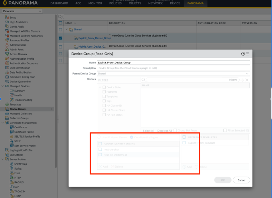 Select CommitCommit to Panorama and Commit your changes.Verify that Prisma Access has the mapping information from the Cloud Identity Engine.- Select PanoramaDevice Groups<template-name>, where <template-name> is the template for the deployment you are configuring, and verify that the Cloud Identity Engine profile is attached to the device group.The following example shows that the device group is successfully attached to the Explicit_Proxy_Device_Group.