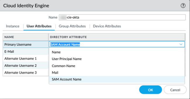 For the User Attributes, select the format for the Primary Username. You can optionally select the formats for the E-Mail and an Alternate Username. You can configure up to three alternate username formats if your users log in using multiple username formats.When you view users in security policy rules, the username displays in the primary username format you select here.