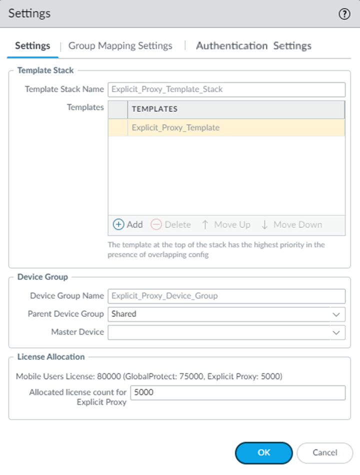 - For a Mobile Users—Explicit Proxy deployment, select PanoramaCloud ServicesConfigurationMobile Users—Explicit Proxy and click the gear to edit the Settings.