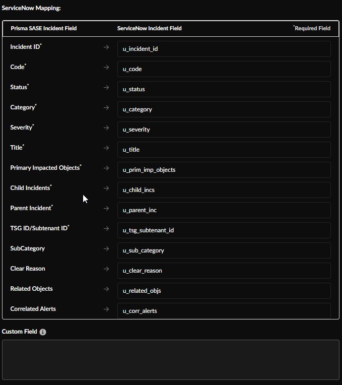 - The Custom Field enables you to customize a static field to use in any way you want. For example, you can set up the Custom Field to show a static value in a column in your ServiceNow table. You can enter a key value pair or multiple key value pairs separated by a comma. For example, Product: Prisma SASE, Environment: production.