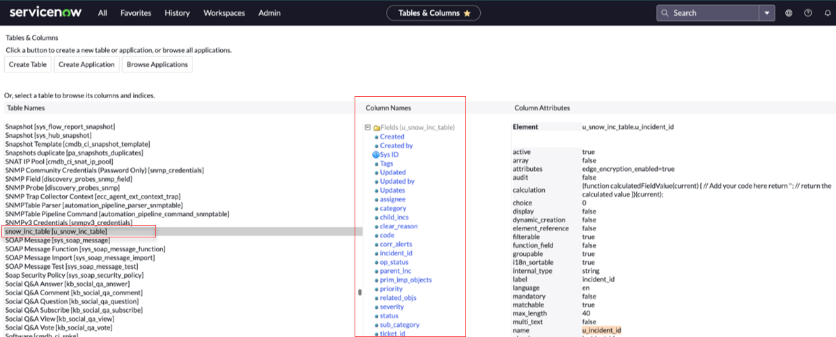 The following image shows how you can find your correct column names from ServiceNow. These are the column names you need to input in your form.