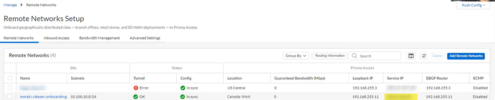 1. Onboard a remote network to use with the Meraki SD-WAN in Cloud Managed Prisma Access.
