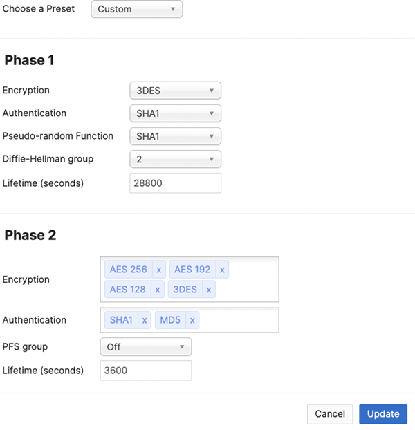 6. (Optional) If required, select Custom in the IPSec Policies area and make sure that the Phase 1 and Phase 2 IPSec tunnel settings match with the IPSec tunnel settings you entered in Prisma Access.