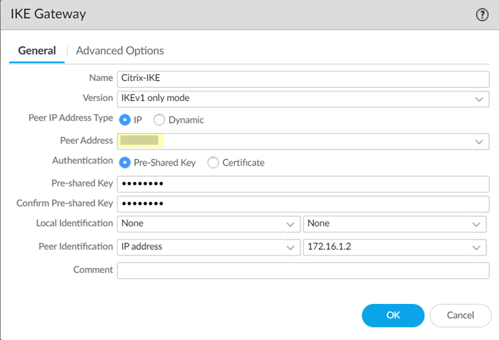- Specify the Citrix SD-WAN Public IP address as the Peer Address.