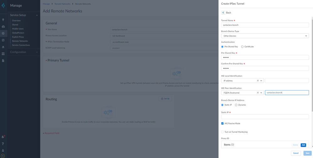 - Enter a Site Name and select a Prisma Access Location that is close to the remote network location that you want to onboard.Select the IPSec Termination Node to use for the remote network.Configure the primary tunnel.