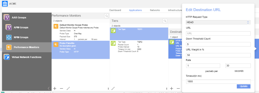 Create Tier 1 URLs, specifying the following values:- Down Threshold Count—Defines the number of consecutive failed probes before the VSD declares a state change and raises an alarm.