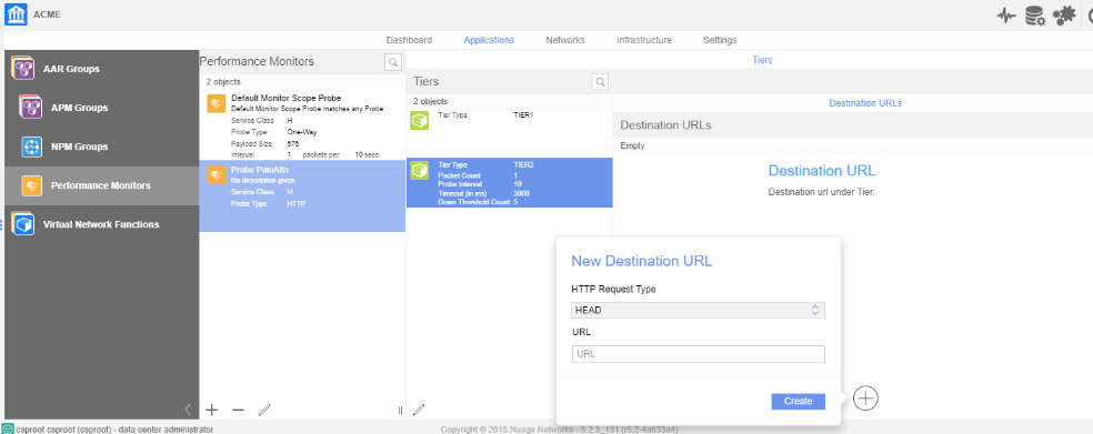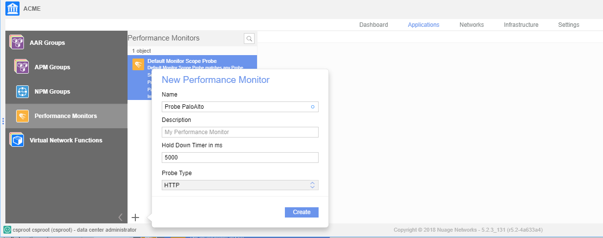 To create an HTTP probe object, complete the following task.- In the Nuage Networks UI, select Performance Monitors.Create a performance monitor with the following values: