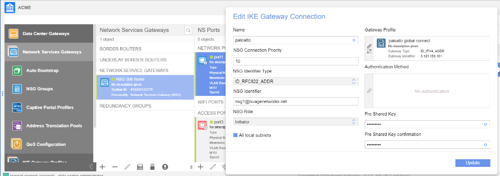 Check the status of the tunnel connection by entering the following command.A status of UP indicates that the connection is successful.A:vsc1# tools vswitch 86.229.176.112 command "nuage-nsg-ike-cli show tunnel-status-summary" ------------------------------------------------------------------------------- Gateway Name Local IP Remote IP Phase1 Phase2 ------------------------------------------------------------------------------- paloalto 192.168.0.103 3.121.193.101 up up -------------------------------------------------------------------------------