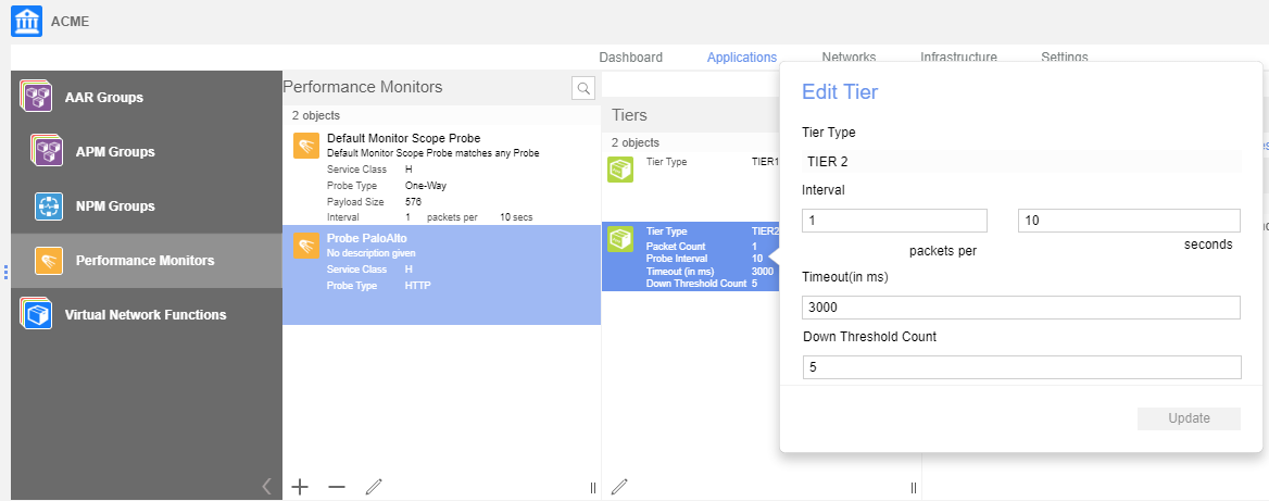 Edit Tier 2 options to change the interval and timeout values of the Tier 2 probe by specifying the following values:- Interval (s)—Defines the rate at which the probe sends packets to the destination target.