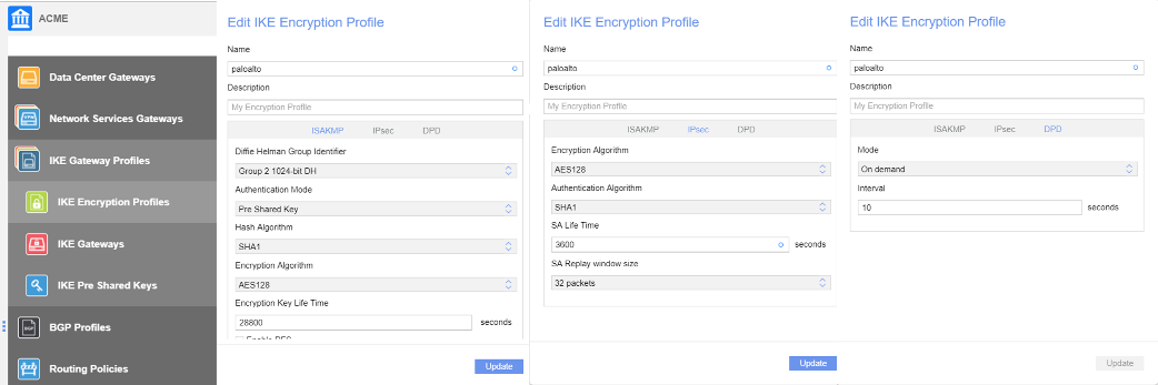 Create an IKE encryption profile.This profile must match the values that you specified in the Prisma Access IPSec configuration.